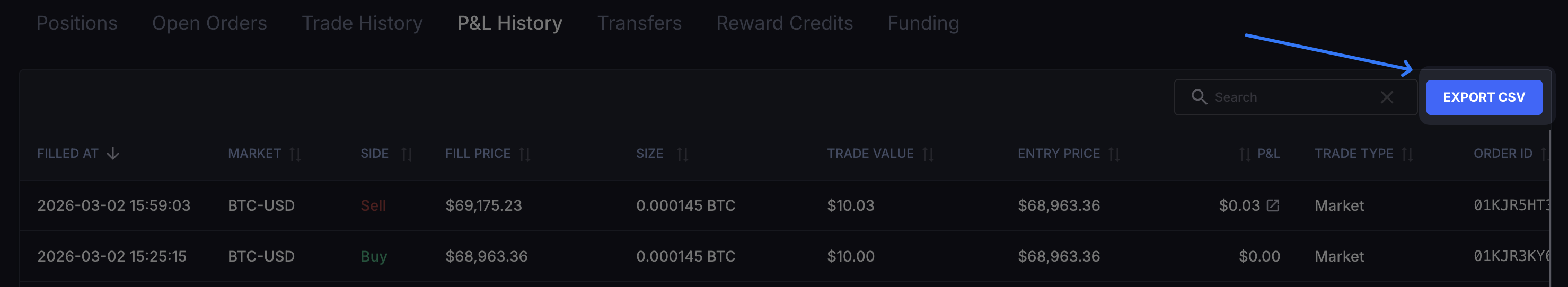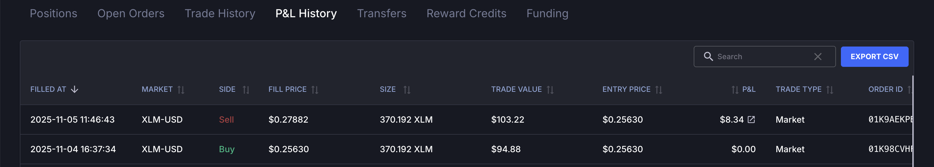 Both the **Trade History** and the **P\&L History** tabs show similar items, but the P\&L History tab makes it easy for you to export and analyze your P\&L per trade.\