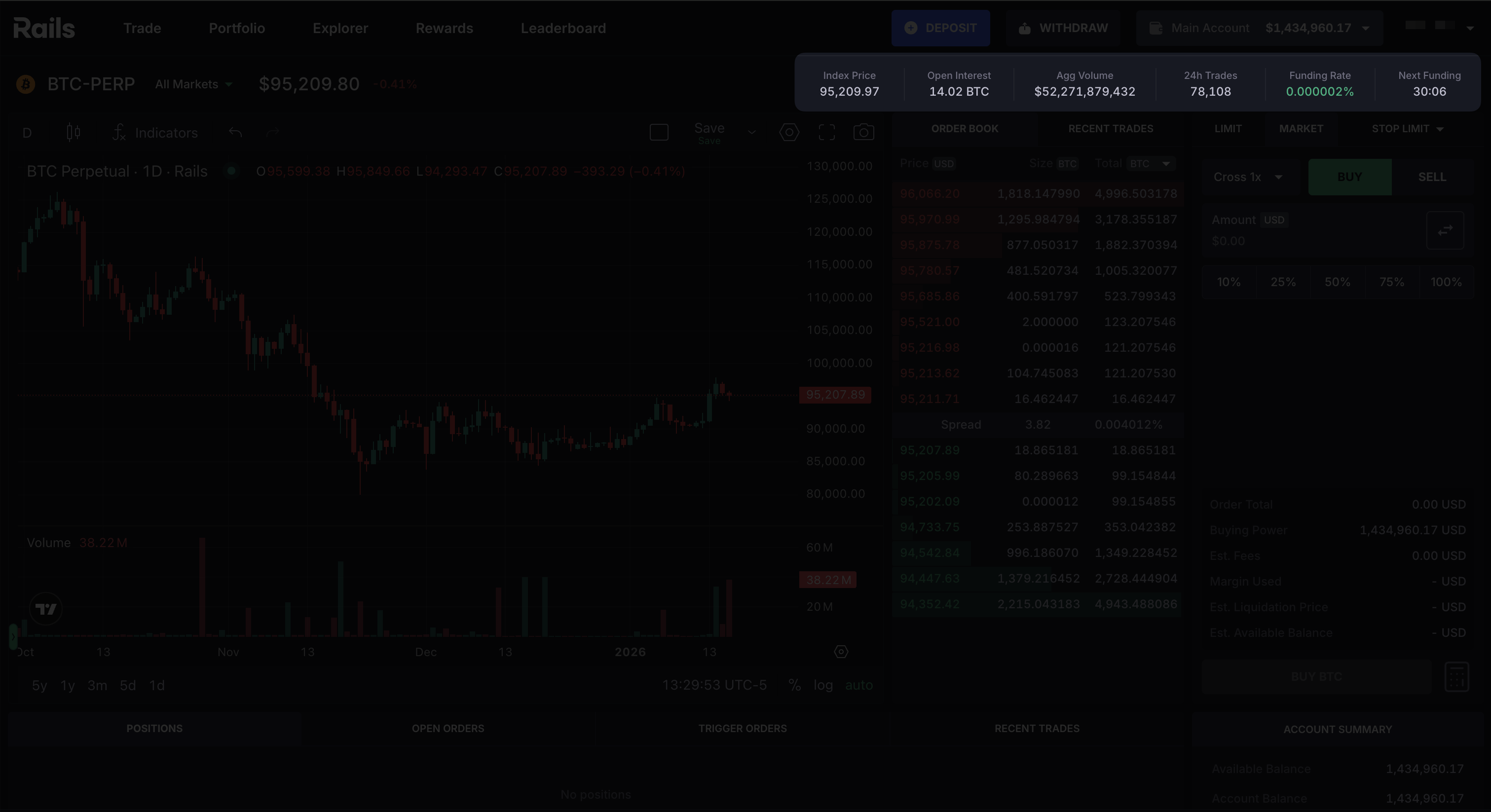 The Rails trading page is the main and most important on the platform. This is where you will place new trades, monitor open positions and analyze market trends. On it you will find the key components laid out below.&#x20;